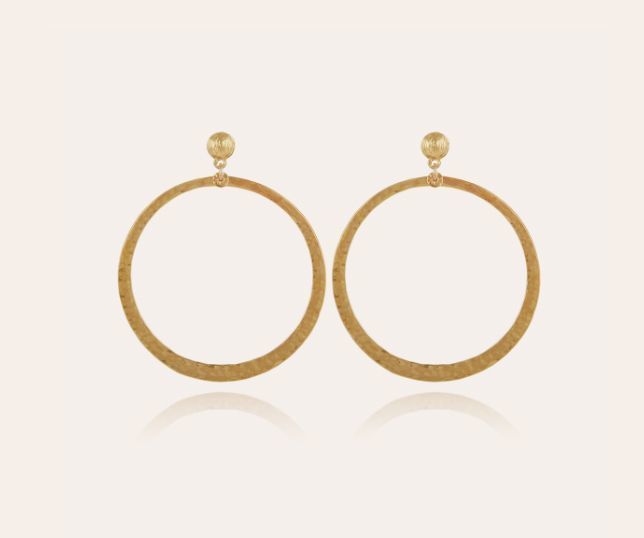 Boucles d'oreilles dorées à l'or fin 24 carats délicatement martelées à la main. Longueur : 6,4 cm - Largeur : 5,1 cm