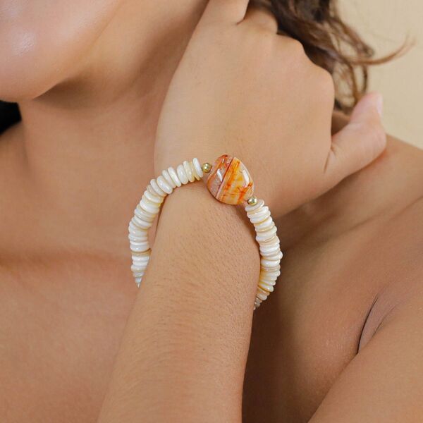 Bracelet extensible en agate rouge et coquillage 18 cm 30,1 g Laiton, coquillage rose, agate rouge